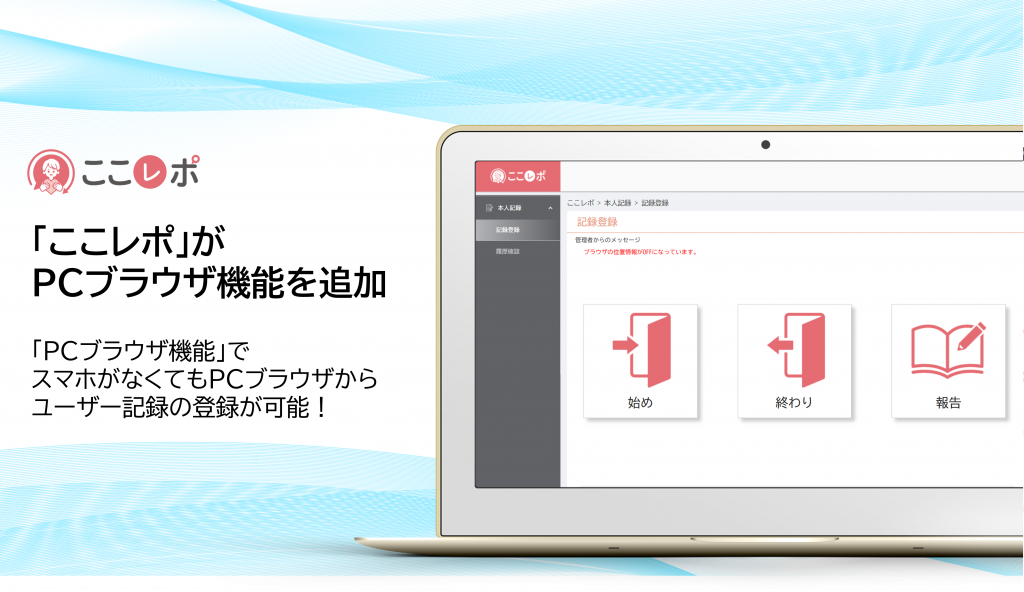これまでスマホアプリでのみ登録が可能であった「始め」、「終わり」、「報告」といったユーザーの登録作業をPCブラウザサイトからも可能にするための機能です。スマホアプリとの併用も可能です。
